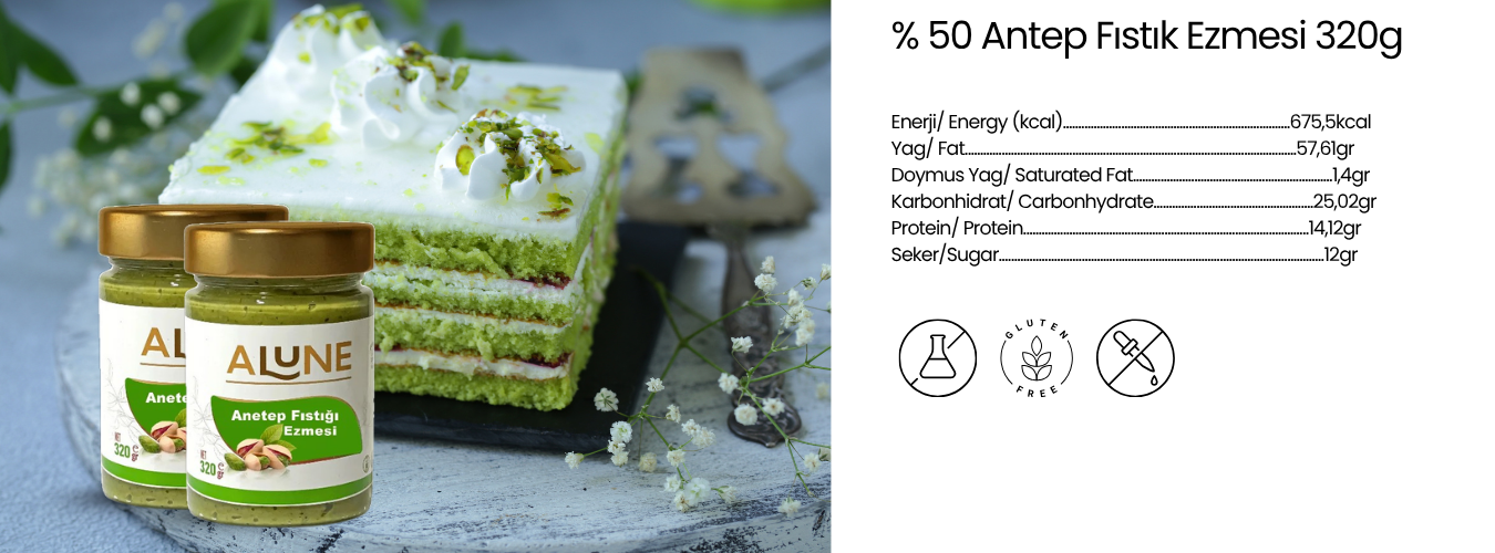 Besin değeri bakımdan zengin, besyeyici yağ oranı yüksek yerli ve Antep Fıstıkları kullanılarak üretilmiştir. Kavrulma derecesi ve işlenme şekli sayesinde besin değeri korunur Tadı ve kıvam bakımından lezzetli en iyi kalite Antep Fıstıklarından üretilmişir. Tazeliğini korumak amacıyla haftalık üretim yapılmaktadır. Sürülebilir kahvaltılarda ve ara öğünlerde keyifle tüketebilirsiniz Yüksek lif oranına sahiptir. Yüksek protein ihtiyacınızı karşılar, sporcular için vazgeçilmez bir takviyedir. Ürünün Üzerindeki yağ yer fındığın doğal yağı olup, bozulma belirtisi değildir. Karıştırarak tüketiniz. Alune Antep Fıstığı Kreması ile her tadımda vazgeçilmez Alune Antep Fıstığı tadını hissedersiniz. Cam kavanoz Ağırlık:320 gr