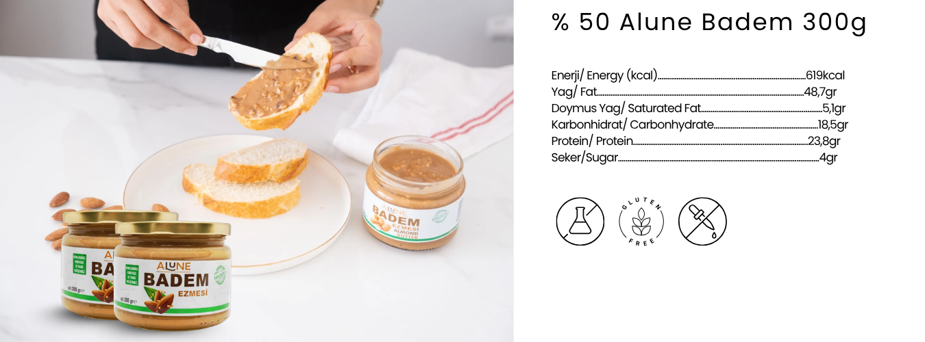 Besin değeri bakımdan zengin, besyeyici yağ oranı yüksek yerli ve doğal bademler kullanılarak üretilmiştir. Kavrulma derecesi ve işlenme şekli sayesinde besin değeri korunarak tadı ve kıvam bakımından lezzetli ve taze ürünler üretilir. Sürülebilir parçacıklı yapısı ile kahvatılarda ve ara öğünlerde keyifle tüketebilirsiniz Alune Badem Ezmesi ile her tadımda vazgeçilmez badem tadını hissedersiniz. Yüksek lif oranına sahiptir. Yüksek protein ihtiyacınızı karşılar, sporcular için vazgeçilmez bir takviyedir. Ürünün üzerindeki yağ yer Bademin doğal yağı olup, bozulma belirtisi değildir. Karıştırarak tüketiniz. Cam kavanoz Ağırlık:300 gr